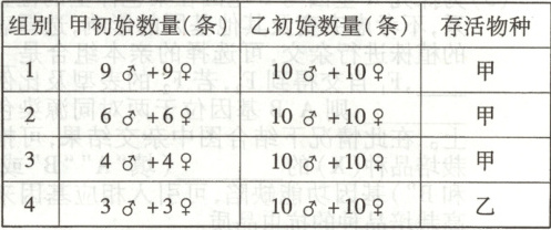 乙的初始数量保持不变,当甲的初始数量大于或等于4♂ + 4♀时,甲在竞争中占优势;当甲的初始数量为3♂ + 3♀时,乙在竞争中占优势。实验中仅存活一种线虫的原因是两者生态位相似,B正确。实验中每组的雌雄个体数量相等,可排除性比对实验结果的干扰,C正确。