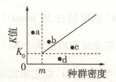 错误项分析 提高K值(如改善栖息地环境、增加资源量)可使种群在稳定时达到更大规模。但a点环境条件下该动物种群的当前密度小于临界密度m,由于只有大于临界密度时种群数量才能增加,因此对a点种群进行有效保护的措施是提高种群密度,A错误。c点种群的当前密度大于m,大于其达到K值时的种群密度,因此该种群发展到稳定期间,种群密度会逐渐减少,种内竞争逐渐减弱,C错误。d点种群的K值小于K₀,处于灭绝环境,即使通过投放措施提高种群密度,种群最终也会灭绝,D错误。