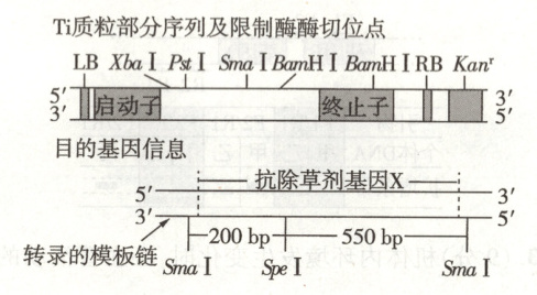 (1)Ti质粒上与其在农杆菌中的复制能力相关的结构为复制原点,复制原点是DNA复制的起始位点,启动复制。切割质粒时,选择限制酶BamHⅠ会破坏终止子,选择限制酶PstⅠ会导致形成的黏性末端无法补平,只能选择SmaⅠ和XbaⅠ对Ti质粒进行全酶切。将产生的黏性末端补平时使用的酶是DNA聚合酶。如果目的基因正向插入,靠近启动子一侧原先被XbaⅠ切割后连接起来的部位不能被SmaⅠ切开,靠近终止子一侧原先被SmaⅠ切割后连接起来的部位仍然能被SmaⅠ切开。选用限制酶SpeⅠ和SmaⅠ进行完全酶切并电泳检测,较短的条带长度近似为550bp。
