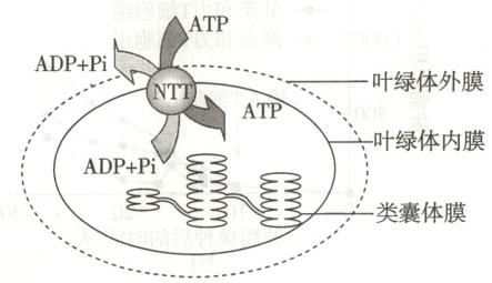 错误项分析 NTT属于载体蛋白,载体蛋白转运时需要与所运输的物质结合,A错误。根据题干信息可知,NTT介导的是顺浓度梯度运输,因此NTT转运物质的方式不是主动运输,B错误。图中进入叶绿体基质的ATP也可能由细胞质基质产生,C错误。