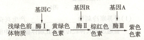 (1)研究发现,水稻颖壳的紫色、棕红色、黄绿色和浅绿色的形成与类黄酮化合物的代谢有关。假设显性基因C、R、A控制颖壳色素的形成,且独立遗传,相应的隐性等位基因不具有该效应。色素合成代谢途径如图。