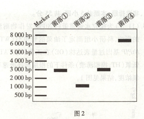 (2)PCR的原理是体外DNA半保留复制,可实现基因片段的大量扩增。结合图1和图2可知,菌落①③PCR产物长度都是3000bp,正好是R基因的长度,说明R基因没有敲除成功。菌落②PCR产物长度是1000bp,说明敲除了R基因中间序列,保留了两端序列,R基因敲除成功。菌落④PCR产物长度是7000bp,正好是重组质粒(4000bp)和R基因(3000bp)的总和,说明重组质粒和内生放线菌R基因组合在一起,形成了7000bp的DNA片段。