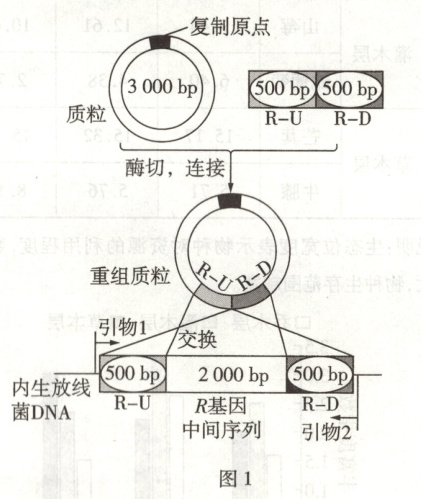 。(2)经筛选获得一株内生放线菌,该菌株高效合成铁载体小分子,能辅助内生放线菌吸收铁离子。R基因是合成铁载体的关键基因之一。科研小组构建R基因敲除株,探究铁载体的功能。主要步骤如下:首先克隆R基因的上游片段R-U和下游片段R-D;然后构建重组质粒;最后利用重组质粒和内生放线菌DNA片段中同源区段可发生交换的原理,对目标基因进行敲除。如图1所示。
