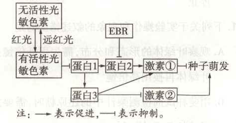 13.D 植物生命活动的调节 红光促进无活性光敏色素转化为有活性光敏色素,有活性光敏色素抑制蛋白1的合成,进而减少蛋白2和蛋白3的合成,蛋白2和蛋白3的含量减少均会使激素①的含量减少,进而减弱激素①对种子萌发的抑制作用,蛋白3的含量减少会减弱对激素②的抑制作用,从而促进种子萌发,因此红光能促进种子萌发;由C项分析可知,EBR也能促进种子萌发,故D正确。
