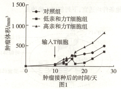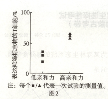 17.CD 免疫调节 分析图1,与对照组相比,低亲和力T细胞组的肿瘤体积较小,说明低亲和力T细胞能够抑制肿瘤生长,C正确。分析图1,与对照组相比,高亲和力T细胞组肿瘤体积较大,说明高亲和力T细胞能抑制小鼠的免疫;分析图2,与低亲和力组相比,高亲和力组表达耗竭标志物的T细胞占比较高,T细胞耗竭程度大,更易耗竭,D正确。