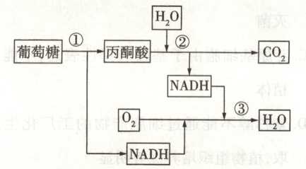 16. 如图为植物细胞呼吸的部分反应过程示意图,图中NADH可储存能量,①、②和③表示不同反应阶段。下列叙述正确的是