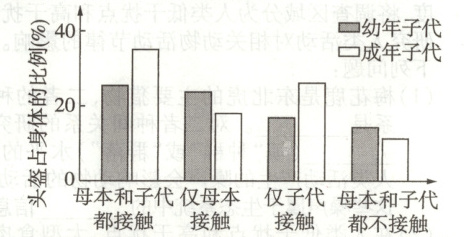 12. 僧帽蚤接触到天敌昆虫的气味分子(利它素)后,头盔会明显增大,从而降低被天敌昆虫捕食的风险。如图所示,僧帽蚤母本和子代接触利它素的情况不同,对子代头盔占身体比例的影响具有明显差异。下列分析错误的是