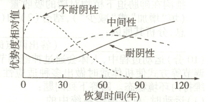17. 某地去除所有植被后,耐阴性不同的树种类群在植被恢复过程中优势度的变化如图所示。下列叙述正确的是