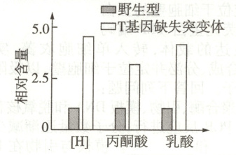 14. 玉米 T 蛋白可影响线粒体内与呼吸作用相关的多种酶,T 蛋白缺失还会造成线粒体内膜受损。针对 T 基因缺失突变体和野生型玉米胚乳,研究者检测了其线粒体中有氧呼吸中间产物和细胞质基质中无氧呼吸产物乳酸的含量,结果如图。下列分析正确的是