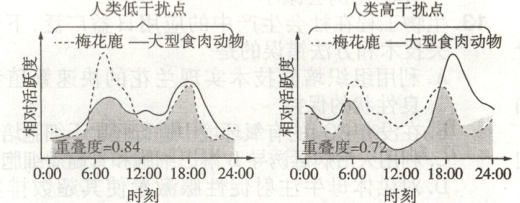(填“日间”或“夜间”)的活跃度明显较高。(3)如果大型食肉动物和梅花鹿每天的活动次数不变,据上图所示,从重叠度角度分析人类高干扰对大型食肉动物的影响是