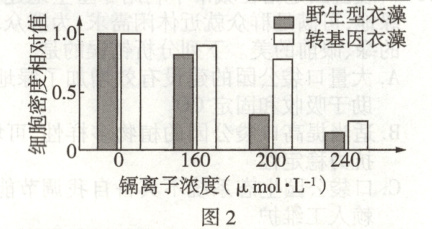 (4)将转基因衣藻和野生型衣藻在不同镉离子浓度的培养液培养 6 天后,检测细胞密度,结果见图2。转基因衣藻在含有不同浓度镉离子的培养液中生长均优于野生型衣藻的原因可能是