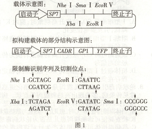 。(2)载体中可用的酶切位点信息和拟构建载体的部分结构如图 1 所示。在将 CADR、GP1 和 YFP 基因逐个构建到载体时,为避免错误连接,需向以上三个基因的两端分别添加限制酶识别序列,其中 GP1 两端应添加