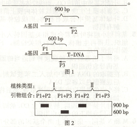 。该植株自交得到 $ F_1$。利用图 1 所示引物 P1 和 P2、P1 和 P3 分别对 $ F_1$ 进行 PCR 检测,电泳结果如图 2 所示。根据电泳结果 $ F_1$ 植株分为Ⅰ型和Ⅱ型,其中Ⅰ型植株占比为2/3