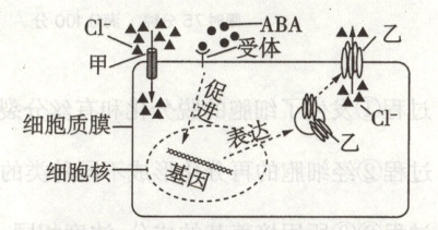 错误项分析 分析题图,Cl⁻通过转运蛋白甲顺浓度梯度进入细胞,属于协助扩散,A错误。由题图知,蛋白甲和蛋白乙的结构不同,Cl⁻通过转运蛋白乙顺浓度梯度运出细胞,而转运蛋白甲将Cl⁻顺浓度梯度运进细胞,故转运蛋白甲、乙的功能不同,B错误。图中ABA与细胞膜上的受体特异性结合,进而促进细胞核基因的表达,ABA并没有进入细胞,C错误。