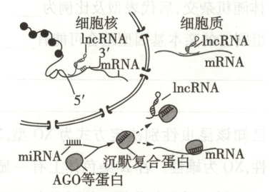 (3)据图可知,在细胞核中,lncRNA与DNA结合,影响基因转录合成mRNA。在细胞质中,lncRNA与mRNA竞争性结合沉默复合蛋白,减少沉默复合蛋白与mRNA的结合,促进mRNA的翻译。miRNA与AGO等蛋白结合形成沉默复合蛋白,沉默复合蛋白可与mRNA结合,降解mRNA,从而阻断翻译过程。