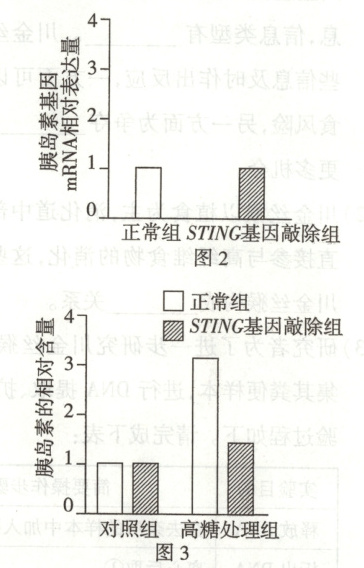 共同维持血糖稳态。②为探究胰岛B细胞中STING缺失与胰岛B细胞功能异常的关系,研究人员以正常小鼠和胰岛B细胞中STING基因敲除的小鼠为研究对象,分别分离了胰岛B细胞,开展两组实验:一组检测细胞中胰岛素基因的表达量,结果见图2;另一组用高糖溶液刺激,检测培养液中胰岛素的含量,结果见图3。根据图2、图3可得出结论: