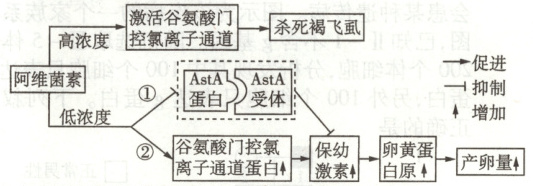 9.A阿维菌素对褐飞虱的影响 据图分析,途径①是低浓度阿维菌素抑制AstA蛋白与AstA受体结合,而AstA蛋白与AstA受体结合会抑制保幼激素增加,使产卵量下降;因此干扰AstA蛋白与AstA受体结合,会使保幼激素增加,进一步使褐飞虱产卵量增加。途径②是低浓度阿维菌素促进谷氨酸门控氯离子通道蛋白增加,使保幼激素增加,最终也使褐飞虱产卵量增加,所以途径①与途径②作用效果相同,A错误,D正确。据图分析可知,高浓度阿维菌素会杀死褐飞虱,低浓度阿维菌素会增加褐飞虱的产卵量,说明阿维菌素对褐飞虱的不同作用效果有浓度依赖性,B正确。由图可知,卵黄蛋白原增加会使产卵量增加,因此可推测雌虫体内成熟生殖细胞的数量与卵黄蛋白原的含量呈正相关,C正确。