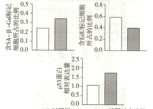 错误项分析:图中仅展示了含SA-β-Gal、EdU标记细胞所占比例和p53蛋白表达量在对照组和AP2A1基因过表达组中的情况,不能据图推测衰老细胞中各种蛋白质的表达量都上升,C错误。