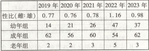 错误项分析:根据题意,除2022年红松结实量最高外,其余四年的结实量没有显著差异,而表中2023年花鼠种群数量明显比2019~2021年多,据此分析,不能说明红松结实量受到花鼠种群数量调控,B不合理。据表分析,性比越大花鼠的种群数量越多,说明花鼠的种群数量波动与其性比之间是有关联的,C不合理。从表中看,调查期间老年组个体数量相对较少,幼年组个体数量呈上升趋势,因此题述花鼠种群的年龄结构不属于衰退型,D不合理。