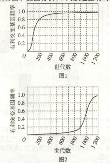 错误项分析:物种形成的标志是生殖隔离的出现,图1曲线说明种群发生了进化,但不能说明形成了新物种,A错误。如果有利突变是隐性突变,那么在突变初期,隐性基因纯合子的占比较低,有利性状不易表现出来,有利突变基因频率增加较慢,相反如果是显性突变,突变个体即表现有利性状,在突变初期,有利突变基因频率增加较快。根据图1和图2分析知,在突变初期,图1中基因频率增加迅速,所以图1中有利突变基因为显性,图2中有利突变基因为隐性,B错误。图2中有利突变基因为隐性,随着世代数的增加,经过长期的自然选择,最后存活的个体可能都是隐性纯合子,因此有利突变基因的频率可能达到1,C错误。