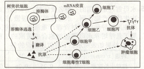 20. (16 分)mRNA - X 是一款新型肿瘤治疗性疫苗,可编码肿瘤抗原,刺激机体产生特异性免疫,从而杀死肿瘤细胞(部分过程如图所示)。该疫苗是由脂质材料包裹特定序列的 mRNA 所构成。