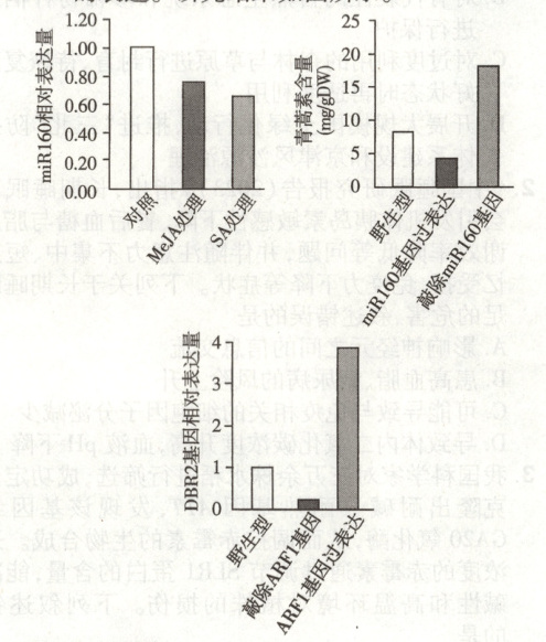 (3)miR160的一种靶mRNA编码ARF1蛋白,该蛋白影响青蒿素合成关键酶基因DBR2的表达,而miR160能与靶mRNA(如ARF1mRNA)结合并导致其降解,从而减少ARF1蛋白的含量,因此miR160通过直接影响ARF1蛋白的含量,调控青蒿素的合成。