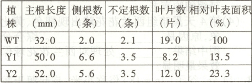 错误项分析 由数据可知,Y2的叶片数、相对叶表面积比WT小,光合总面积减小,A错误;图中数据显示Y1和Y2的多项指标是有差异的,无法说明它们的细胞分裂素含量相同,B错误;Y2的侧根和不定根数量均高于WT,因此施加细胞分裂素类似物后其侧根和不定根数量不会增加,D错误。