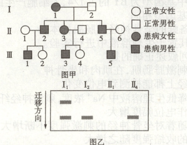 错误项分析 根据题干信息可知,PCR扩增的引物是根据$\mathrm{A_1}$和$\mathrm{A_2}$基因设计的,如果电泳结果只有$\mathrm{A_2}$对应的1条条带,基因型可能是$\mathrm{AA_2}$(正常)或$\mathrm{A_2A_2}$(患病),因此电泳结果相同的个体表型不一定相同,A错误。由B项分析可知$\mathrm{III_1}$基因型是$\mathrm{A_1A_1}$,若$\mathrm{III_1}$($\mathrm{A_1A_1}$)与正常女子(AA或$\mathrm{AA_2}$)结婚,生了一个患病后代,则只能是$\mathrm{A_1}$导致的,C错误。$\mathrm{II_5}$基因型为$\mathrm{A_1A}$或$\mathrm{A_1A_2}$或$\mathrm{A_2A_2}$,$\mathrm{II_6}$没有患病,其基因型可能为AA或$\mathrm{AA_2}$,又知子代$\mathrm{III_5}$只有1条条带且患病,推测其基因型为$\mathrm{A_1A_1}$或$\mathrm{A_2A_2}$,论证$\mathrm{III_5}$基因型可能为$\mathrm{A_1A_1}$或$\mathrm{A_2A_2}$,D错误。
