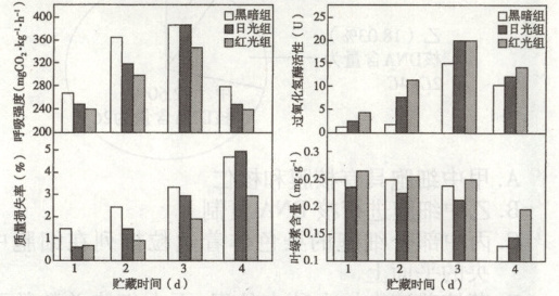 (4)根据题图可知,第4天黑暗组叶绿素含量显著下降,即叶绿素分解加快,进而使类胡萝卜素颜色显现出来,西兰花花球出现褪色、黄化现象。综合分析叶绿素含量、质量损失率、过氧化氢酶活性、呼吸强度随贮藏时间的变化,可知红光处理对西兰花花球保鲜效果最明显。