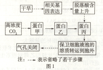 图1:干旱、高浓度调控气孔关闭的机理,干旱导致相关基因表达,脱落酸含量上升;高浓度作用于蛋白甲,蛋白甲作用于蛋白乙,蛋白乙作用于蛋白丙,蛋白丙导致保卫细胞液泡的溶质转运到胞外,气孔关闭。