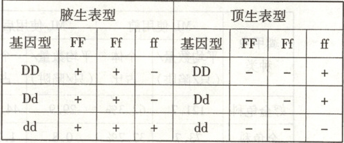 。(3)定位于6号染色体上的基因D/d可能与(2)中的现象有关。为了验证这个假设,用两种纯种豌豆杂交得到$ F_{1}$,$ F_{1}$自交产生的$ F_{2}$表型和基因型的对应关系如表,表格内“$+$”、“$-$”分别表示有、无相应基因型的个体。