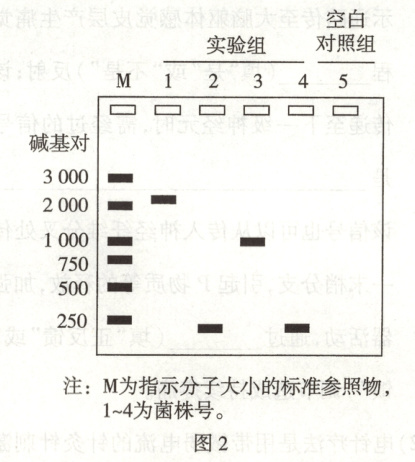连接DNA片段,构建重组质粒,大小约9.5 kb(kb为千碱基对),假设构建重组质粒前后,质粒pYL对应部分大小基本不变。(2)进一步筛选构建的质粒,以1~4号菌株中提取的质粒为模板,使用引物1和引物2进行PCR扩增,电泳PCR产物,结果如图2。在第5组的PCR反应中,使用无菌水代替实验组的模板DNA,目的是检验PCR反应中是否有