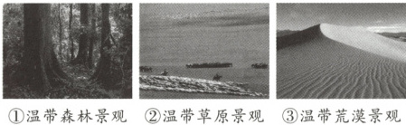 ①温带森林景观 ②温带草原景观 ③温带荒漠景观