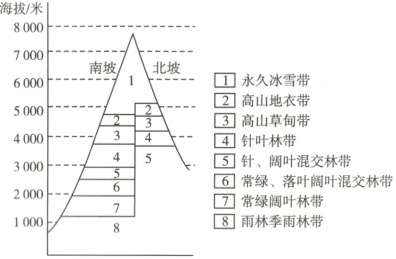 (2)题,读图可知,该山地山麓基带的自然带为雨林季雨林带,再结合由山麓到山顶的自然带变化,山顶有永久冰雪带,且山地海拔很高,近8000米,故A项正确。喜马拉雅山脉南坡为西南季风的迎风坡,降水量多,故南坡冰雪带下界比北坡低。