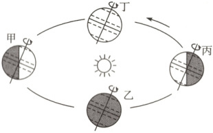 3.C 4.B 解析 第3题,读图可知,在地球公转轨道上,甲为夏至日,乙为秋分日,丙为冬至日,丁为春分日。第4题,从2023年冬至日(12月22日)至2024年春节(2月10日),地球经过近日点,在近日点,地球公转速度最快,因此从冬至日至春节,地球公转速度先变快再变慢。