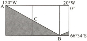 下图中 ACB 为晨昏线,C 为中点。 图示范围内阴影区为黑夜,其他地区为白天。 据此完成 1~2 题。