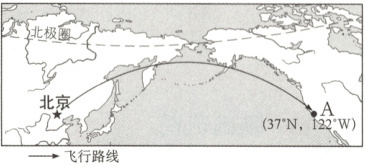 一位中国公民从北京(东八区区时为 25 日 16 时)飞往美国的 A 城市探亲,飞机飞行时间为 11 小时 20 分钟。 读下面飞机