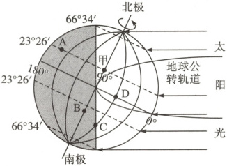 (4)题,读图可知,昼半球的平分线为0°经线,即太阳直射点所在的经线;再根据晨昏线与极圈相切且北极圈内出现极昼现象,判断出此日为夏至日,太阳直射北回归线,因此此时太阳直射点的坐标是(23°26′N,0°)。第