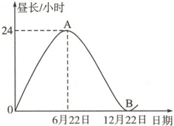 5.B 6.B 解析 第5题,由图中6月22日昼长为24小时,12月22日昼长为0小时可知,该地位于66°34′N。第6题,B点是12月22日,北极圈及其以北地区出现极夜现象。