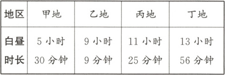 下表为12月22日甲、乙、丙、丁四地白昼时长统计数据。结合表中的数据,完成3~4题。