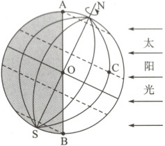 解析 根据地球自转的方向及昼夜的分布状况可以判断,O地为晨线与赤道的交点,地方时为6时,C地所在的经线与O地所在的经线相差60°,地方时相差4小时,C地在O地的东边,所以地方时为10时。