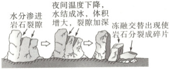 冰楔作用指在岩石裂缝内所含的冰融水经反复冻融,体积时涨时缩而造成岩层破碎的作用。读下图,完成 1~2 题。