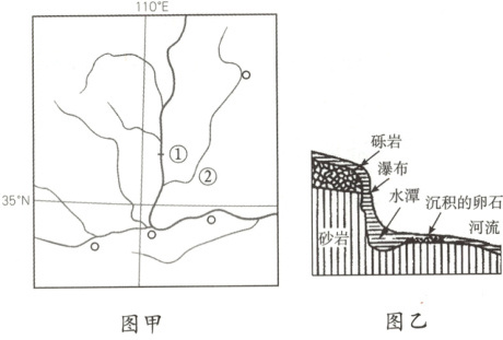 (1)题,根据图甲中的河流形态及纬度,可判断为黄河,黄河地处季风气候区,夏季降水最多,瀑布流量最大。第