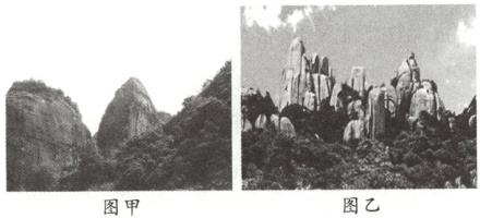 武夷山属于典型的丹霞地貌,是地质时期沉积的巨厚的红色岩层,经地壳运动和外力作用形成的一片红色群山。太姥山属于典型的花岗岩地貌,是地质时期由岩浆上升冷凝而成的花岗岩,经地壳运动和外力作用而形成,花岗岩的球状形态是其典型的地貌特征。图甲为武夷山丹霞地貌景观图,图乙为太姥山花岗岩地貌景观图。读图,完成 3~4 题。
