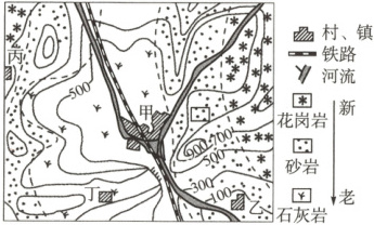 (2)题,结合图中的等高线可知,甲城镇地处盆地,其成因为背斜成谷。第