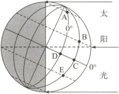 (3)题,晨昏线图上晨线与赤道交点的地方时为6时,根据D、C两点与晨线和赤道的交点的经度差可计算地方时差,进而求出两地的地方时。第