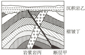 12.C 13.A 解析 第12题,依据图示岩浆岩丙与断层甲的形态可知,该处应先出现褶皱,然后岩浆喷出形成岩浆岩,后来出现断层,最后上层接受沉积。第13题,由图中岩层的弯曲状况可以判断该处褶皱为背斜,背斜顶部及断层处岩层破碎,易于采石;该处有断层存在,不宜修建大型工程;背斜内并不都存在油气。