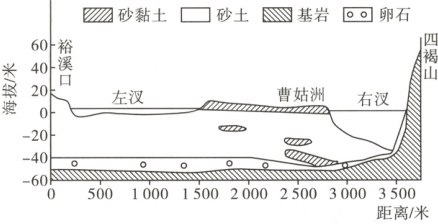 读下面长江裕溪口—曹姑洲—四褐山河床地质剖面图,完成10~11题。