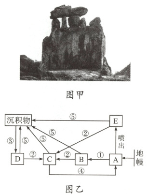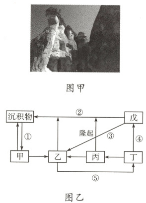 苏州鸡笼山海拔53.6米,为花岗岩山体。山不高,有二峰。主峰宛如巨大竹笋拔地而起。其上乱石嶙峋,杂树苍苍,藤蔓垂挂,仿佛一座硕大的山石盆景。次峰更奇,山巅险峻异常,数块怪石笔立,上面还卧着几块奇石,危如垒木,现称“五人撑伞”。图甲为“五人撑伞”景观图,图乙为岩石圈物质循环示意图。据此完成24~25题。