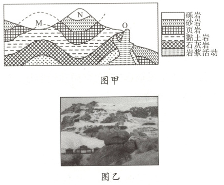 27.(13分)图甲为某地的地质剖面图,图乙为图甲中O地某处花岗岩球状地貌景观图。读图,完成下列问题。
